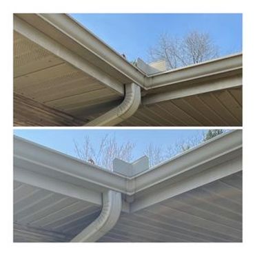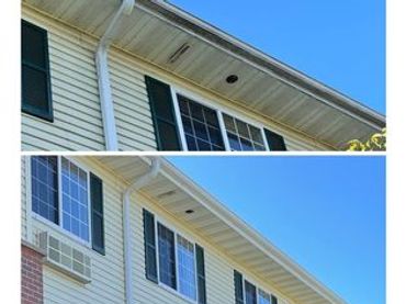 The exterior of gutters often times accumulate more dirt/algae quicker then the siding on a home does. We wash the exterior of gutters as well as soffit and facia as part of our house wash service.
